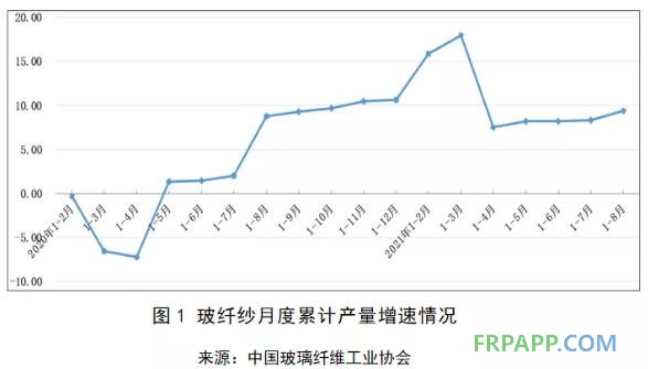 1-8月我國(大陸地區,下同)玻璃纖維紗總產量同比增長9.4%,其中8月份單月產量同比增長13.2%。因2020年下半年及2021年一季度行業產能擴張較少,行業玻纖紗產量保持溫和增長,但增速逐步加快。近期海外玻纖產能因疫情出現明顯萎縮,在下游風電、汽車、電子及出口等市場拉動下,玻璃纖維紗市場供需持續偏緊,多品種玻纖紗價格屢創新高。