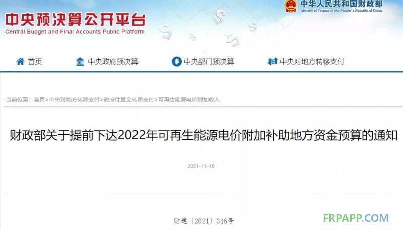 2021年11月16日,中央預算公共平臺發(fā)布“關于提前下達2022年可再生能源電價附加補助地方資金預算的通知”。根據(jù)通知,本次下達總計新能源補貼資金38.7億元。其中,風電15.5億元、光伏22.8億元、生物質(zhì)3824萬元。