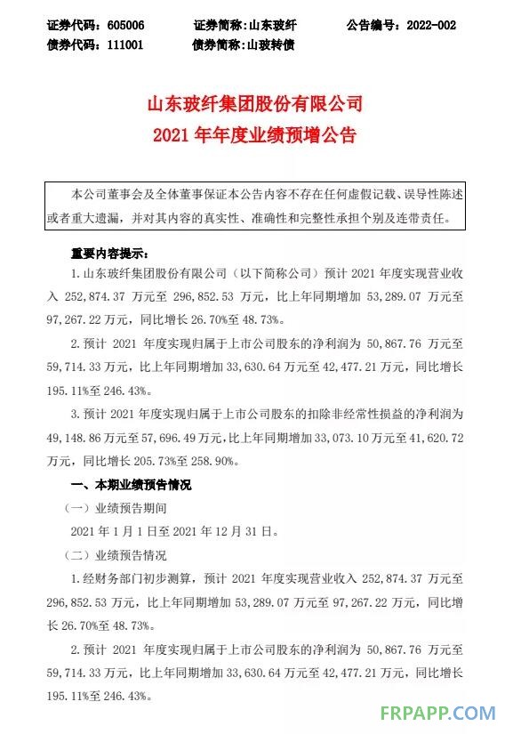 山東玻纖發布公告,公司預計2021年度實現營業收入25.29億元至29.69億元,同比增長26.70%至48.73%;預計2021年度實現歸屬于上市公司股東的凈利潤為5.09億元至5.97億元,同比增長195.11%至246.43%;預計2021年度實現歸屬于上市公司股東的扣除非經常性損益的凈利潤為4.91億元至5.77億元,同比增長205.73%至258.90%。