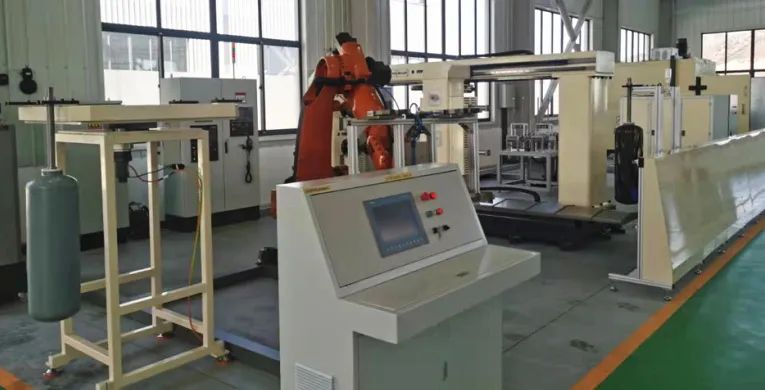 該示范線配置了內膽準備工作站、機器人上下料及搬運系統、自動樹脂混合和供膠系統、雙驅纏繞系統、自動貼紗切斷系統、氫氣瓶卸料自動輸送系統、目視檢查和緩沖站、自動固化裝置、待測試氣瓶準備站等裝置裝備,采用工控機工作站集中管理各個工位和機器人,實現了系統的全信息化流程控制。