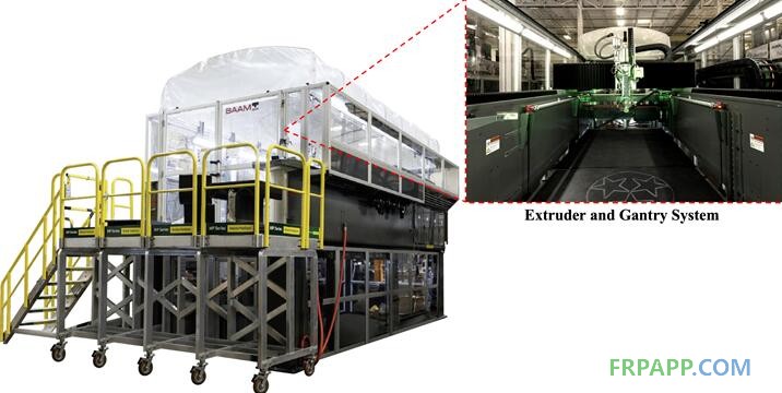 從修邊模具到耐高溫、耐高壓的熱壓罐模具,ORNL的團(tuán)隊(duì)曾經(jīng)對(duì)3D打印聚合物和金屬的模具作過研究。該項(xiàng)目則是ORNL第一次嘗試采用3D打印的方法來制造一種用于模壓成型SMC的聚合物模具,這可能也是在全球開展的第一個(gè)這樣的研究工作。ORNL的MDF采用的大型增材制造(BAAM)打印機(jī)由美國辛辛那提公司和ORNL共同開發(fā),這臺(tái)擠出(熔絲制造類型)打印機(jī)裝有大型噴嘴(直徑10.16 mm),沉積速度45kg/h,能采用粒料形式的聚合物原料打印出長6m、寬2.5m以及高1.8m的部件。BAAM打印機(jī)能夠快速打印出大型部件的代價(jià)是打印的分辨率低,同時(shí)會(huì)產(chǎn)生凹凸不平的表面,因此需要后續(xù)加工。為了確保在打印及清理完畢后獲得正確的尺寸,打印的模具路徑會(huì)略有增大。