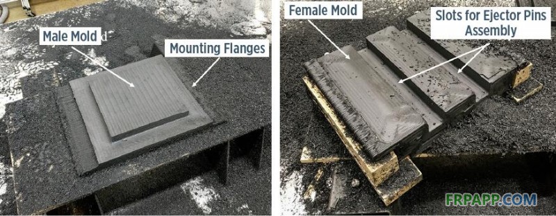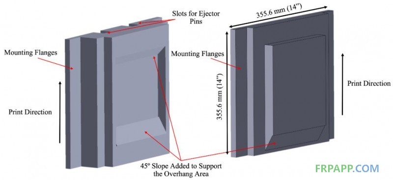 研究人員們首先采用碳纖增強(qiáng)PPS打印了一副正方形的飾板模具(如圖2所示),其最終的外形尺寸是355.6mm×355.6mm×3.2mm,要求該模具要能夠承受1.03MPa的成型壓力和130~150℃的成型溫度。為了便于打印,他們改變了模具中凸起部分的角度(90°)并垂直打印了最長的一面(在Z軸上)。此外,為了防止冷卻過程中熱的熱塑性塑料在凸起區(qū)域坍塌,他們添加了可移動(dòng)的45°倒角支撐,隨即會(huì)在打印完成后用機(jī)加工方式將其去掉。模具的芯模和型腔側(cè)面在BAAM機(jī)器中被并行打印出來,整合到打印中的其他特征還包括插槽,它被打印在陰模的背面,用來容納頂出銷(如圖3所示)。鑒于打印后需要加工,以使成型表面獲得可接受的光潔度,他們將尺寸加大了5.08mm。打印后,將模具內(nèi)表面加工光滑,并在容納4個(gè)頂出銷的位置上進(jìn)行鉆孔,以將一個(gè)氣動(dòng)頂出銷系統(tǒng)安裝到模具中。