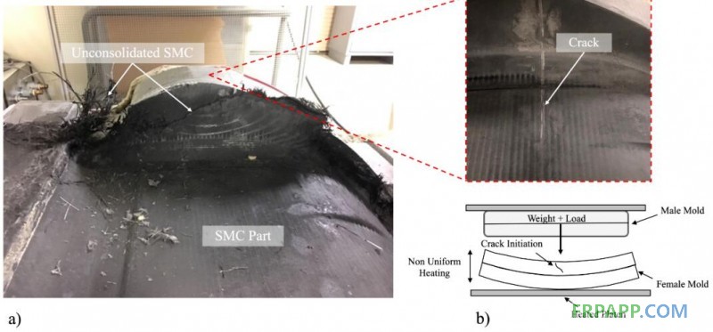 圖7 對(duì)更大更復(fù)雜的汽車座椅靠背模具進(jìn)行加熱和保溫都有難度,導(dǎo)致模具不均勻的加熱和變形,從而在部件中表現(xiàn)出固化不良(a)和開裂(b)問題(圖片來自O(shè)RNL)