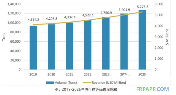 圖6顯示了以2019年作為基線到2025年全球原生碳纖維市場(chǎng)規(guī)模,2020年全球原生碳纖維產(chǎn)量約9.67萬(wàn)噸、市場(chǎng)規(guī)模42.05億美元,而到2025年預(yù)計(jì)將達(dá)到12.75萬(wàn)噸、52.77億美元,2020-2025年兩者年復(fù)合增長(zhǎng)率分別為5.7%、4.6%。