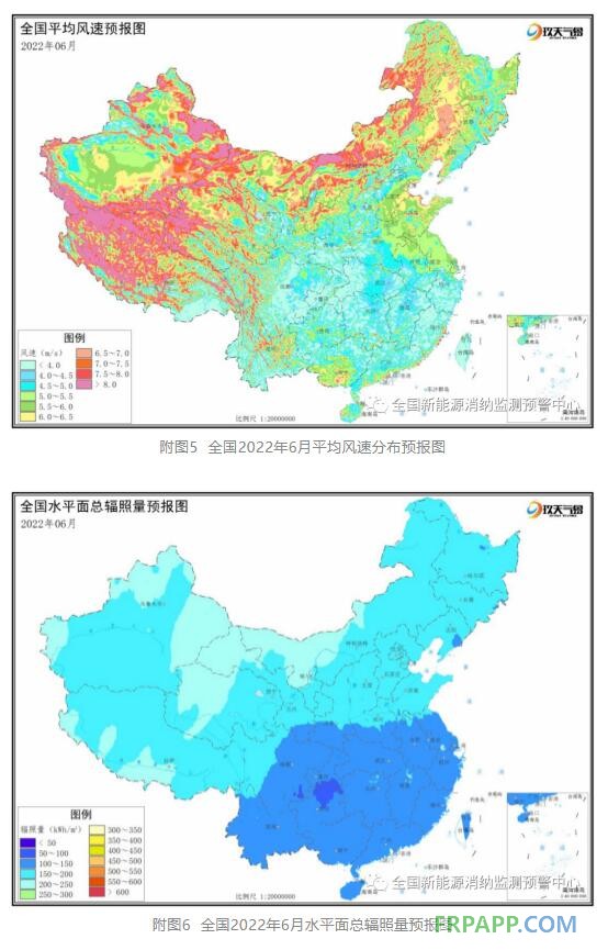 6.1 二季度全國大部地區平均風速隨月份增加呈減小趨勢,平均水平面總輻照量隨月份增加呈增加趨勢。