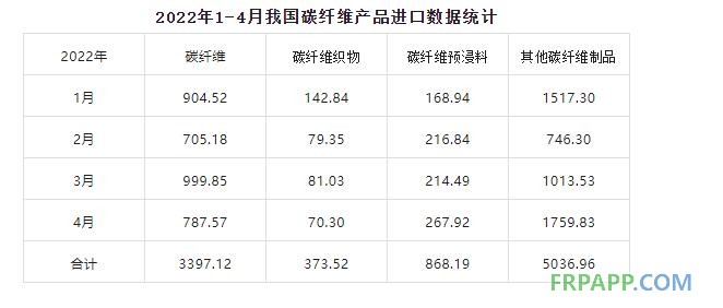 據(jù)海關(guān)數(shù)據(jù)統(tǒng)計(jì),2022年4月我國(guó)進(jìn)口碳纖維787.57噸,進(jìn)口碳纖維織物70.30噸,進(jìn)口碳纖維預(yù)浸料267.93噸,進(jìn)口其他碳纖維制品1759.83噸,進(jìn)口碳纖維產(chǎn)品合計(jì)2885.63噸。2022年1-4月我國(guó)累計(jì)進(jìn)口碳纖維3397.12噸,進(jìn)口碳纖維織物373.52噸,進(jìn)口碳纖維預(yù)浸料868.19噸,進(jìn)口其他碳纖維制品5036.96噸,進(jìn)口碳纖維產(chǎn)品合計(jì)9675.78噸。