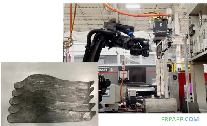 ORNL開發(fā)的工藝名為AMCM(增材制造+模壓成型),它將一臺采用機器人的擠出打印機與隨后的模壓成型步驟集于一體。