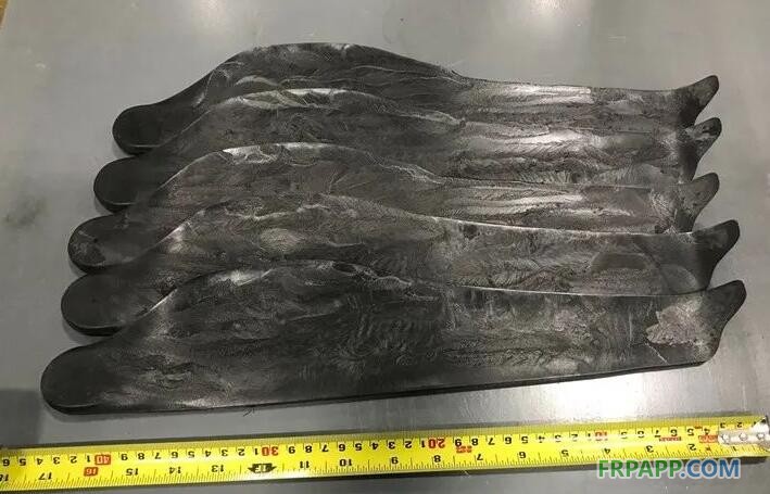 大型復合材料部件的3D打印+模壓成型:為實現(xiàn)高性能的大型3D打印復合材料部件的大批量生產(chǎn),美國橡樹嶺國家實驗室開發(fā)了一種名為AMCM的系統(tǒng),該系統(tǒng)組合了機器人、基于擠出的3D打印機和模壓成型設(shè)備。第一個試驗案例是此圖所示的螺旋槳葉片,最終的應(yīng)用目標是能夠生產(chǎn)汽車電池盒及其他高產(chǎn)量的復雜形狀的產(chǎn)品