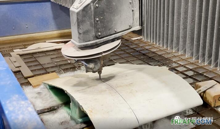 專注于可持續(xù)性:ORNL為回收報廢部件而開發(fā)的解決方案包括用水刀切割風機葉片(圖示),粉碎后通過3D打印或其他工藝進行再利用