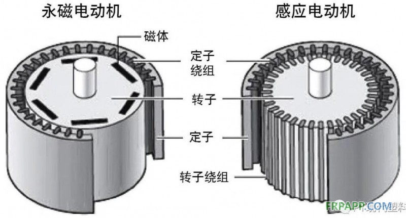 永磁電動機通過嵌入磁體產生自己的電磁場,而感應電動機則是通過電池的電力被磁化(圖片來自newenergyandfuel.com)