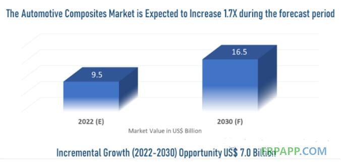 9月28日,Reports and Insights網站發布了2022-2030年汽車復合材料市場的未來發展與機遇分析專題報告,根據市場分析,預計到2022年底,汽車工業用復合材料市場規模將達到95億美元,預計到2030年將達到165億美元,2022-2030年的復合年增長率將達到7.0%。