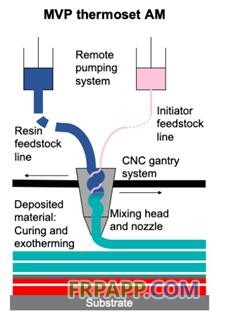 2017年,Magnum Venus Products (MVP)推出了被稱為反應性增材制造(RAM)的3D打印機生產線。RAM打印機與其他大畫幅打印機的不同之處在于,它們使用液態、熱固性材料,這些材料被泵送并與有機過氧化物結合,沉積在連續的層中。