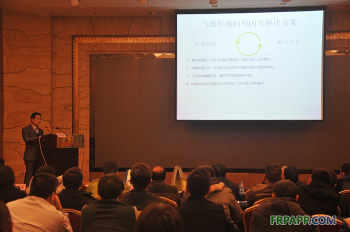 這次會議的主題是大力推進閉模成型工藝技術。會議除了主題報告外,大部分的時間是觀摩示范。作為主辦方,有意識的將示范場地設置在會場一角,使到會代表親身體驗,聞不到一點逸出的苯乙烯氣味。這次會議安排了四類閉模成型工藝操作示范,有輕質閉模抽真空灌注成型工藝(LRTM)、軟膜真空袋閉模抽真空灌注成型工藝、輕模硅膠膜閉模抽真空灌注成型工藝、閉模碳纖維預浸料抽真空工藝等。對環氧精密注膠工藝、高壓注射閉模成型工藝等閉模注射夾心結構抽真空灌注成型工藝和閉模樹脂模抽真空成型工藝利用視頻進行了詳細的講解和應用案例的分析。會議上還對閉模抽真空灌注成型工藝的各種材質模具制造、模具密封和鎖模設計、流道設計和溢流口、纖維鋪層、工藝控制、膠衣噴涂要領和吸水阻隔等進行了講解。許多代表從聽到看,從看到問的過程,深切感到多種閉模成型工藝,給他們開闊了眼界,結合企業的現狀,可根據產品要求,采用和設計滿足產品性能要求的灌注工藝,也可嫁接其他閉模工藝的組合 ,如預成型工藝、低壓澆鑄工藝等。