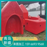 3)防撞設施安裝 節段組裝成兩個 U 形段后,即可運至墩身處進行安裝。每個 U 形段分別各用一 艘拖輪拖動,緩緩靠近墩身,在拖輪拖動的同時需保證防撞設施的平衡性,靠近后改用拖輪頂推移動的方法,將兩個U形段圍繞橋墩固定,調節整體平衡,將之實現鎖口對接,拼接成完整封閉的浮式防撞設施。