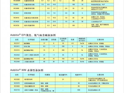 ------ R&O 油 -------- HL 液壓油 -------- 燃汽和蒸汽汽輪機油 -------- 壓縮機油 --------- 潤滑脂 Additin RC9321是具有**的抗氧和防銹和中等抗磨性能的無灰添加劑復合劑, Additin RC9321,特別推薦用于下列高標準必須被滿足的潤滑劑的生產: - 高氧化安定性 - 優異的熱穩定性 - 優異的水解安定性 - 無油泥形成 - 非常低的酸值 - 很好的鐵和非鐵金屬防銹性能 - 很好的破乳化性能 - 很好的抗泡性能 上述性能可以在很低的加入量時以及在不同的基礎油,例如在聚 α烯烴,烴類,HVI 和 II 類基礎油中達到. 推薦加入量為為 0.3-0.6% (wt).?