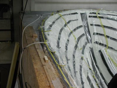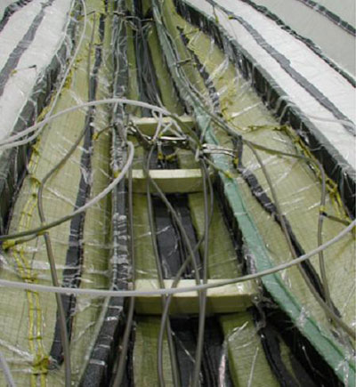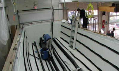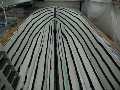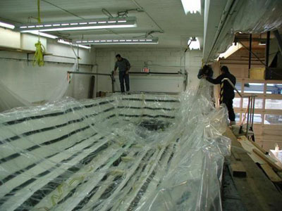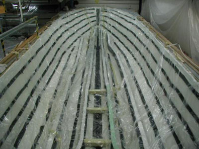 圖7,開始導入樹脂,從船的中心線上開始,樹脂管一條條開啟