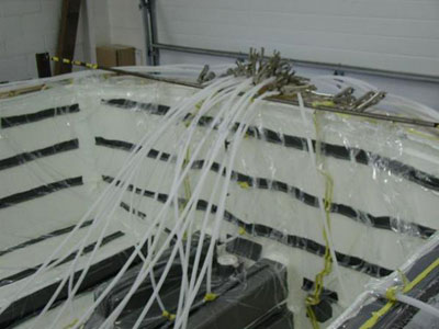 圖9,整條船導入完成,關閉樹脂入口,繼續抽真空,直到樹脂固化,注意這張圖里的樹脂已經有點發綠,實際上已經固化。