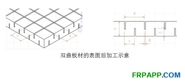 該表面處理是在20世紀(jì)70年代晚期率先發(fā)明,在兩側(cè)采用90o按照正方形網(wǎng)格對芯材進行切割(一側(cè)和另一側(cè)位置偏移半個網(wǎng)格寬度)。切割稍深于芯材厚度的一半(總厚度的60%),在和另一面切割的每個交叉位置形成小孔。這幫助樹脂從芯材的一面,流到另外一面,樹脂均勻浸潤整個鋪層。較小的切割寬度可以將樹脂吸取量最小化,比其他切割方式較少的印透。采用雙曲表面處理的芯材非常適用于大半徑和/或小曲率外形。密度在200kg/m3以下的NAVICEL剛性PVC泡沫芯材可進行切割表面處理。