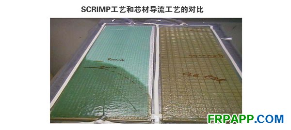 上圖左側(cè)面板是一種典型的SCRIMP工藝,右側(cè)面板是表面開槽的芯材導(dǎo)流工藝。這些面板同時開始進行導(dǎo)流,左側(cè)面板導(dǎo)流不到1/2,右側(cè)則幾乎全部浸潤。