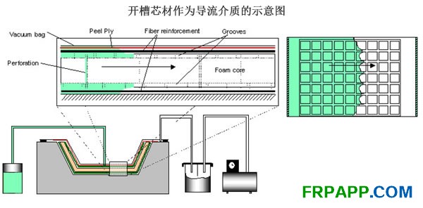 采用芯材樹脂導(dǎo)流工藝時,值得注意的是夾層結(jié)構(gòu)中泡沫芯可以作為樹脂分布介質(zhì),泡沫表面的槽允許樹脂能夠流動快捷,泡沫的開孔能夠幫助樹脂在鋪層的兩個表面按照相同的速度流動。