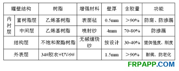 此層為耐腐蝕層,它的作用是防腐蝕、防滲漏;材料由樹脂膠衣和表面氈組成,采用耐腐蝕樹脂,樹脂含量大于90%,厚度為0.5mm,此層的選材直接影響到設(shè)備的使用壽命,所以此層我們選用乙烯基樹脂。