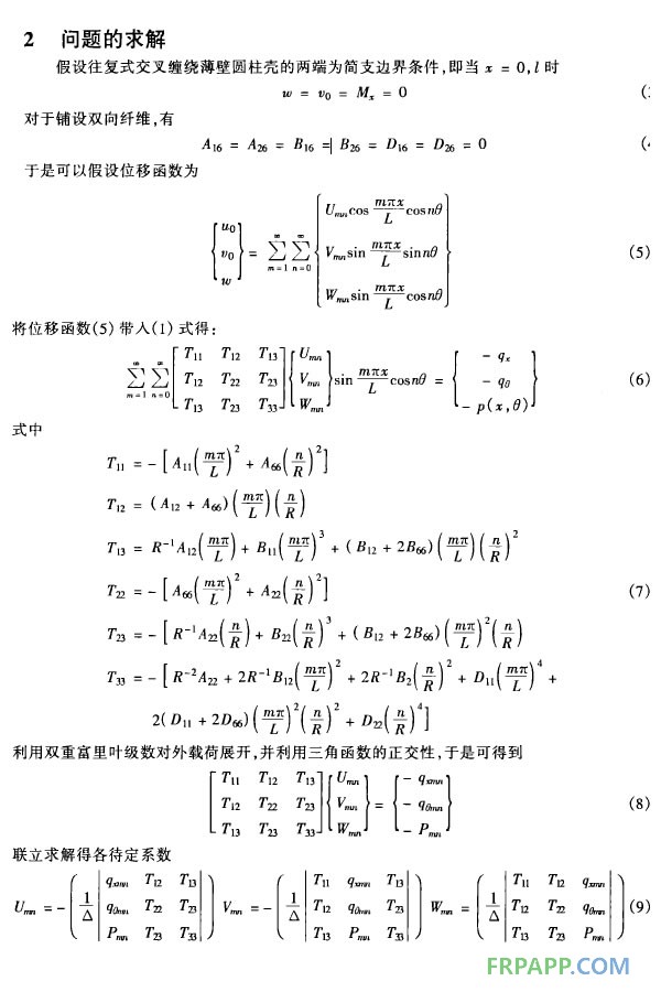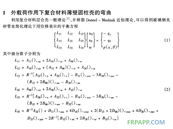 纖維纏繞玻璃鋼夾砂管(FRMP) 是20世紀(jì)70年代發(fā)展起來的一種新型復(fù)合材料制品,是采用短玻璃纖維離心或長玻璃纖維纏繞,中間夾砂工藝制作,內(nèi)外層結(jié)構(gòu)從功能上分可簡化成5層,由內(nèi)至外依次為內(nèi)襯層、內(nèi)交叉纏繞層、環(huán)向加砂纏繞層、外交叉纏繞層和外保護(hù)層。玻璃鋼夾砂管具有上述材質(zhì)管道所不具有的優(yōu)點(diǎn),如輕質(zhì)高強(qiáng)、耐腐、水流摩阻小、接口密封性能好、安裝施工方便、生產(chǎn)工藝簡單、綜合經(jīng)濟(jì)效益較好、使用壽命長等,并作為一種新型的復(fù)合管材已逐漸為業(yè)內(nèi)人士所接受,可用于城市給排水、海水淡化、農(nóng)用灌溉、石油化工等領(lǐng)域。本文求解了外載荷作用下玻璃鋼夾砂管的位移變形理論解,并對承受徑向和軸向載荷作用的情況給出算例,繪制了位移變形圖.