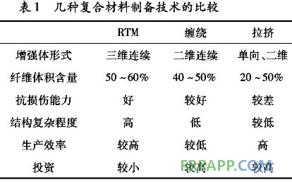RTM是樹脂傳遞模塑工藝的縮寫(Resin TransferMolding),一般指在模具的型腔里預先鋪放增強材料,合模后,在一定的溫度和壓力下將樹脂注入模具,浸漬織物增強體并固化,最后脫模得到制品的一種工藝。RTM成型工藝是從濕法鋪層和注塑工藝演衍生出來的一種新的復合材料成型工藝,是目前航天航空先進復合材料的發展方向之一。運用于航天產品的RTM成型工藝制造的復合材料,其使用的纖維增強體采用編織成型,產品價格較高,但隨著國內多家企業對編織技術、編織機械的大力發展,編織體的價格已大幅下降,為RTM成型技術在航天產品的廣泛應用提供了可能。RTM技術是一種適宜多品種、中小批量、高質量復合材料生產的成型技術,近年來得到聲迅速發展。美國國家宇航局對RTM給予了高度重視,并認為該技術是制造結構材料的一種成本低、效益好的方法。RTM與纏繞、拉擠等幾種復合材料制備技術的綜合比較見表1。從表1可以看出,RTM在這幾項低成本制造技術中的綜合優勢是明顯的。