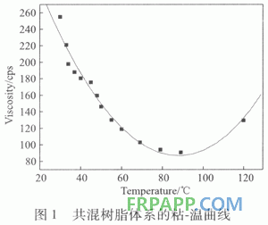 由圖1可以看到,樹脂體系在30℃時粘度僅為255cps。在30~89℃之間,樹脂體系粘度隨溫度增加先是呈遞減的趨勢,并在當溫度為89℃時,粘度達到最小,約為90cps,而后隨溫度的增加,體系的粘度逐步上升。溫度的上升對樹脂的粘度有以下兩方面影響[7,8]:一方面溫度升高使分子的運動活性增大,從而樹脂體系的粘度降低;另一方面固化反應形成交聯網絡,限制分子的運動而使粘度增加。在開始階段,反應程度較低,所以升溫導致粘度下降的影響是主要的;當升溫和固化交聯對粘度影響相等時,粘度為最低;溫度再升高,反應程度增加,固化交聯使粘度迅速上升。