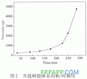 圖2所示為室溫下樹脂體系的粘-時曲線。從圖2中可以看出,樹脂體系粘度在400cps下可保持約100min;然后,隨著時間的增加,粘度迅速上升,200min左右樹脂體系粘度達到1000cps。