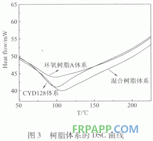 由圖3可以看出,混合樹脂體系和環氧樹脂A、CYD128相似,都只有一個反應峰,說明兩種樹脂在此比例混合下,具有很好的相容性,這一結論與前面相容性驗證結論一致。由于混合樹脂中CYD128含量較高,混合樹脂的反應峰向CYD128體系的反應峰靠攏。