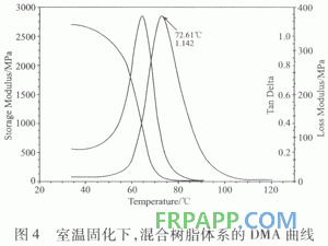 DMA能反映出在強迫振動下測試材料的動態力學性能隨溫度的變化,可用于測試材料的Tg以及高溫力學性能等。圖4所示為混合樹脂體系在室溫固化24h下的DMA曲線。由圖4可以看到,室溫固化下,混合樹脂體系的損耗因子tanδ的峰值溫度即Tg約為72℃,體系損耗因子的最大值為1.142,說明該樹脂體系具有較好阻尼性。