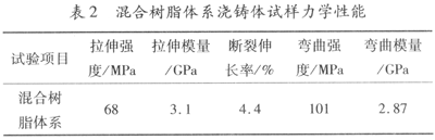 混合樹脂體系澆鑄體試樣的力學性能結果見表2。