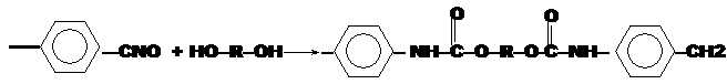作為一種增稠用乙烯基樹脂,自然要求樹脂具有以下的特點:①與增強材料和填料的良好浸潤性;②初始的低粘度和快速增稠特性;③良好的力學特性,包括韌性和耐疲勞特性等;④較長的存放周期;⑤較低的固化放熱峰和較低的苯乙烯揮發等。為了達到使用效果,在乙烯基樹脂的合成研究中,原來較通用的方法是:在乙烯基酯分子上引入酸性官能團(羧酸),再利用這些羧基與堿土金屬氧化物(如氧化鎂、氧化鈣等),但這種方法增稠時間長,一般需要幾天時間,況對含水量敏感,在本文中主要討論該種增稠方法的乙烯基樹脂?,F在也發展了另外一種方法,即用聚異氰酸鹽和多元醇反應以產生網狀結構,從而達到樹脂的快速稠化,該方法可適合于低壓成型,具有粘度控制穩定、對溫濕度要求低、存放期長的特點,同時制品的層間結合強度高的特點,同時也可以用帶過量醇的低酸值樹脂作稠劑。該方法的原理如下: