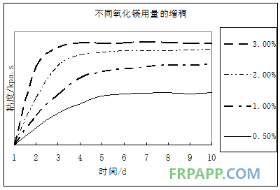 從以上圖表中可以清楚的看出:氧化鎂的增稠效果是最好的,一是早期的增稠效果速度比較快,但與有同等情況下的一些不飽和樹脂的增稠相比,氧化鎂的增稠特性也相對較慢一點,一般通用的不飽和增稠樹脂在24-40小時左右即可達到粘度的穩定值,而乙烯基則要50小時以上;
