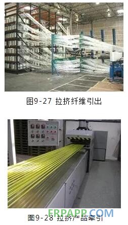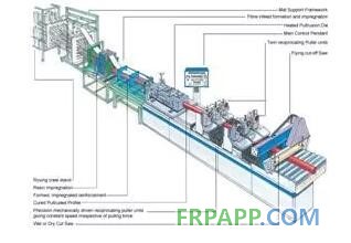 增強材料(纖維及氈材等)排布→浸膠→預成型→擠壓模塑及固化→牽引→切割→制品
