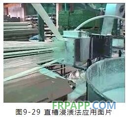 從原料架上引出的增強材料經過紗板集束整形后,進入膠液浸漬裝置。在直槽浸漬法中,膠液浸漬裝置由以下幾部分組成:托架、浸漬槽、接膠盤、膠液儲存桶、循環泵。浸漬槽前后兩面均放置導向板,導向板上按照需要設置紗孔和氈槽,以維持增強材料的有序排列。從紗孔和氈槽中漏出的膠液落到接膠盤中,再收集在儲存桶,通過循環泵打到浸漬槽中使用。必要時,還可以設置循環水套管和控制樹脂溫度的加熱器,以優化工藝。