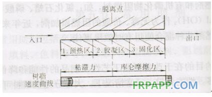 一般來講,認為玻璃纖維浸膠后通過加熱的金屬模具,按其在模具中的不同狀態,把模具分為三部分,如圖所示。