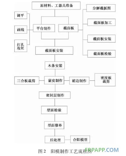 鋼構代木陽模的優點是模具型面質量高,缺點是加工周期長、價格高;木質陽模的優點是加工周期短、成本低,缺點是模具型面質量較差。下面以木質陽模為例,講述陽模的制造工藝技術,圖2為木質陽模制作工藝流程。