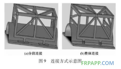 模具對鋼架的第二點要求是其外形與模具的玻璃鋼殼體要隨形, 保持模具復合材料層與鋼架連接的協同變形。目前40m以上長度的葉片基本都使用環氧樹脂。環氧樹脂在固化過程中需要加熱,同時葉片在合模過程中粘接膠也需要加熱固化,這就使模具的復合材料層和鋼架處于不同溫度中,因此解決復合材料和鋼材熱脹冷縮時的矛盾變得非常重要。目前有兩種方式。圖9(a)為第一種方式,即在鋼架與復合材料層之間采用分段連接。預先在模具復合材料層上每隔一定距離糊制預埋件,預埋件與鋼架之間采用連接套筒固定,使模具復合材料面層與金屬鋼架自由均勻伸長,減少了熱應力的產生。圖9(b)為第二種方式,即在鋼架與復合材料層之間采用整體連接。此種方式在模具前后緣部分固定兩根通長的鋼管,鋼架每隔一定距離與鋼管采用滑動裝置連接,該連接可以在軸線方向、軸線垂直方向和上下方向進行調節, 在保證正常生產產品的同時減少了模具的應力集中, 增加了模具的使用壽命。