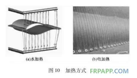 目前風電葉片模具最有效且最流行的加熱方式如圖10所示,為水加熱和電加熱。圖10(a)為水加熱示意圖, 水循環加熱方式是利用銅管作為加熱管路布滿模具產品區以及分模面上形成模具加熱的框架,并在銅管之間填充傳熱介質來實現模具加熱后的熱傳遞,外接大功率的水加熱器,直接把熱水注入到模具的銅管中,并實現熱水循環。圖10(b)為電加熱示意圖。電加熱易于監控、 操作方便、加熱效率高且能大大減輕模具的重量,但是易于發生故障,使用壽命也不及水加熱方式的長。