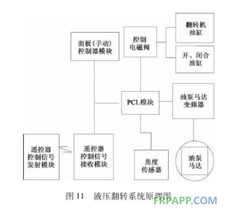 液壓翻轉是目前國外比較流行的翻轉方法。全自動液壓翻轉設備由翻轉架、液壓系統以及電控系統3部分組成,不僅可以實現翻轉過程的自動化,提高翻轉效率,使翻轉過程平穩,而且還能更好地保證模具精度和壽命, 提高葉片生產的質量,其液壓翻轉系統原理如圖11所示。