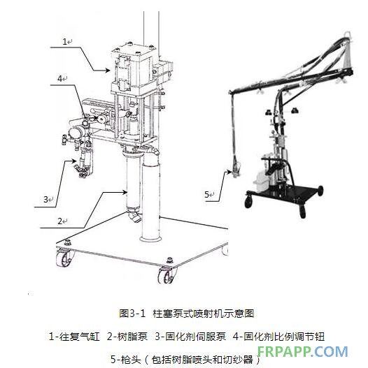 噴射機主要由樹脂輸送系統(tǒng)、樹脂噴射系統(tǒng)和無捻粗紗切割系統(tǒng)組成,即輸料泵、噴槍和切紗器。其功能是將樹脂與固化劑等助劑混合噴出并霧化、將纖維按設(shè)定長度切斷并分散噴向樹脂的霧化扇面上,由樹脂夾帶纖維落向模具表面,隨噴射方向的移動,在模具表面形成一層疏松的纖維、樹脂混合物。其中,樹脂的噴出速度和纖維的切割速度均單獨可調(diào),從而實現(xiàn)產(chǎn)品要求的纖維含量。不同類型的噴射機,其各組分的混合順序、噴出方式、速度和比例的調(diào)整方式可能存在差異,但均可實現(xiàn)上述功能。