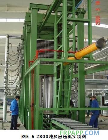 目前熱壓大都采用液壓機,可滿足產品成型所需的單位壓力,最高可達12.5MPa,壓力穩定小于±500KPa,可根據工藝要求設定。多層壓機的噸位一般較大,通常為2000-3000t。圖5-6為2800噸多層壓機實物圖。