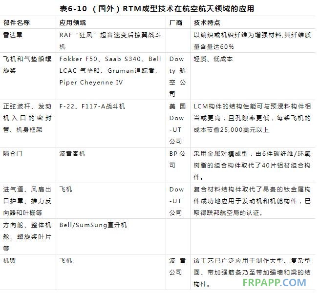 國內應用和研究RTM工藝的單位較多,如航空材料研究院、637所、703所、北京玻璃鋼研究設計院、北京航空航天大學等。應用的產品有雷達罩、全碳纖維復合材料槳葉、導彈穩定翼等。