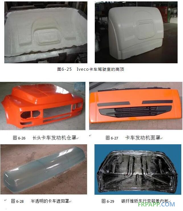 Iveco卡車駕駛室的高頂采用RTM法成型,由意大利的Pianfei IPA的Mondovi廠制造。車頂總成的總面積為6m2,重量為45kg,樹脂為間苯樹脂,采用的預成型材料是熱成型連續纖維氈。