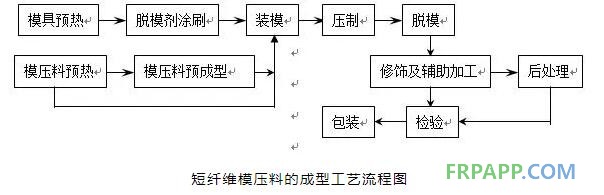 短纖維模壓料模壓成型工藝基本過程是:將一定量經一定預處理的模壓料放入預熱的模具內,施加較高的壓力使模壓料填充模腔。在一定的壓力和溫度下使模壓料逐漸固化,然后將制品從模具內取出,再進行必要的輔助加工即得到產品。其簡要流程圖如圖所示: