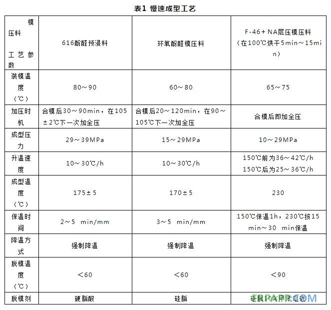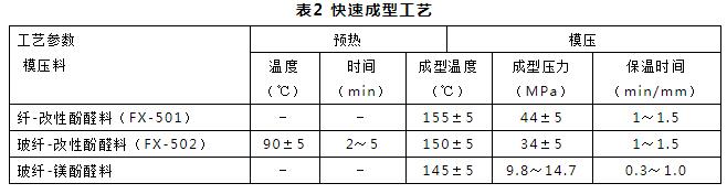 選定何種工藝主要取決于模壓料類型,此外還應考慮生產效率及制品結構、尺寸性能要求等。慢速成型工藝見表1,快速模壓成型工藝見表2: