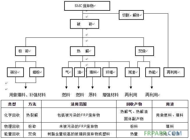 SMC/BMC復合材料的回收處理示意圖見圖,回收方法比較見表: