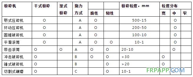 適用于FRP廢棄物的破碎機,按其作用力度的大小分,有壓縮型破碎機、沖擊型破碎機、切斷型破碎機、壓縮切斷型破碎機、沖擊切斷型破碎機等等。常見的各種破碎機如表所示: