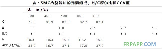 經離心分離過的熱裂解油經過了仔細的分析研究。在300、400、500、600和700℃的5個試驗溫度下所得SMC熱裂解油的基本成分的H/C摩爾比和GCV值見表。由表可以看到,H/C比值相當低(1.1-1.3),這反映了液體的芳香特性,而較高的氧含量(10-16%)則來自于聚合物中的氧化結構。這些值在400-700℃之間亦基本不受溫度影響,但在300℃時,H/C比值和氧含量均比在其他溫度時高。
